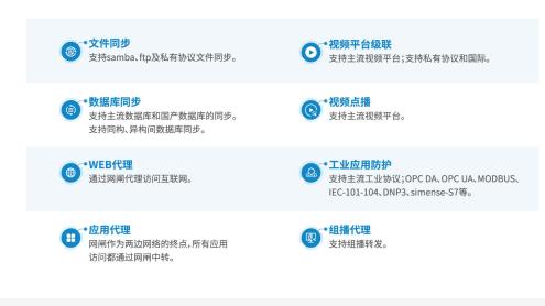 網絡信息安全等級保護網閘采用“2+1”的系統架構,由內、外網主機單元與數據交換單元(隔離交換芯片)三部分組成,基于多核多線程專用專用安全操作系統,采用類似船閘擺渡的工作原理在內、外主機之間擺渡應用數據,安全隔離網絡的同時做實時的數據交換。深信服網閘產品功能不斷創新,由最初的簡單文件交換功能,逐步增加了復雜的數據庫同步、視頻平臺級聯、組播代理等功能,以滿足不同業務系統數據共享、視頻網絡互聯、廣電播出網數據交換等復雜網絡隔離交換的需求。