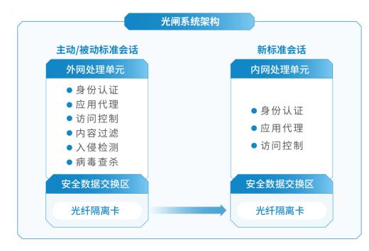 基于SFP光模塊中發光器和收光器分離的技術特點,深信服單向光閘的兩個主機之間只是通過外網主機光模塊的一個發光器與內網主機光模塊的一個收光器連接,從而從物理原理上實現了數據的絕對單向傳輸?;趩蜗騻鬏敳考?,結合傳統安全隔離網閘的“擺渡+代理”技術,單向光閘在保證單向數據傳輸的同時,保證數據的實時、準確、可控傳輸。