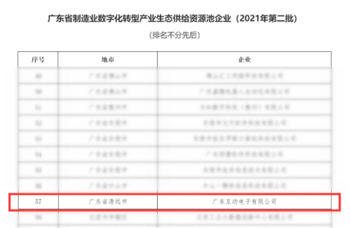 近日,廣東省制造業數字化轉型產業生態供給資源池企業(2021年第二批)評審結果公示,廣東互動電子有限公司憑借出色的產品技術、優秀的服務案例成功入選。